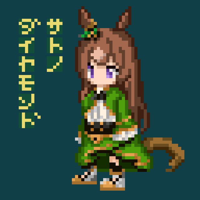 サトノダイヤモンド!!ジンクスブレイカーとして家族のために頑張る女の子。お金持ちらしく家にUFOキャッチャーのマシンがあるらしい。マックイーンに憧れているらしい。一部はマックちゃんに圧勝していますが・・・ #ウマ娘 #ドット絵