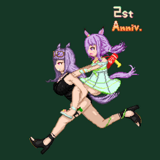 12 46 遅くなりましたが、ウマ娘アプリ2周年おめでとう☆去年はゴルシとマックちゃんが同じタイミングで水着実装されるという素敵な年でしたね☆今年もこの二人の絡みが追加されることを期待しています♪孫とじいじ #ウマ娘2周年 #ドット絵 23/03/01 22:40