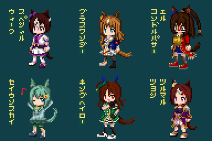 黄金世代の並びにツルちゃんも追加してみた。並びとしてはうまゆる的にスぺちゃんのとなりがツルちゃんがよかったかもしれないけど、グラスちゃんに怒られそうなのでこの並びにしました。みんな可愛い☆ #ウマ娘 #ドット絵