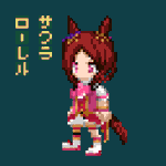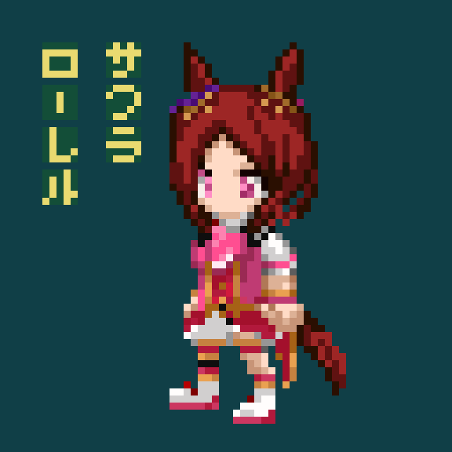 サクラローレル!!おめめが桜の子。生まれつき足が強くなく、けがに悩まれ続けたが何度も立ち上がる強い子。普段は優しいお姉さん系である。ナリタブライアンに特別な想いがありいつか倒したいと思っている。特別・・・?・・・? #ウマ娘 #ドット絵