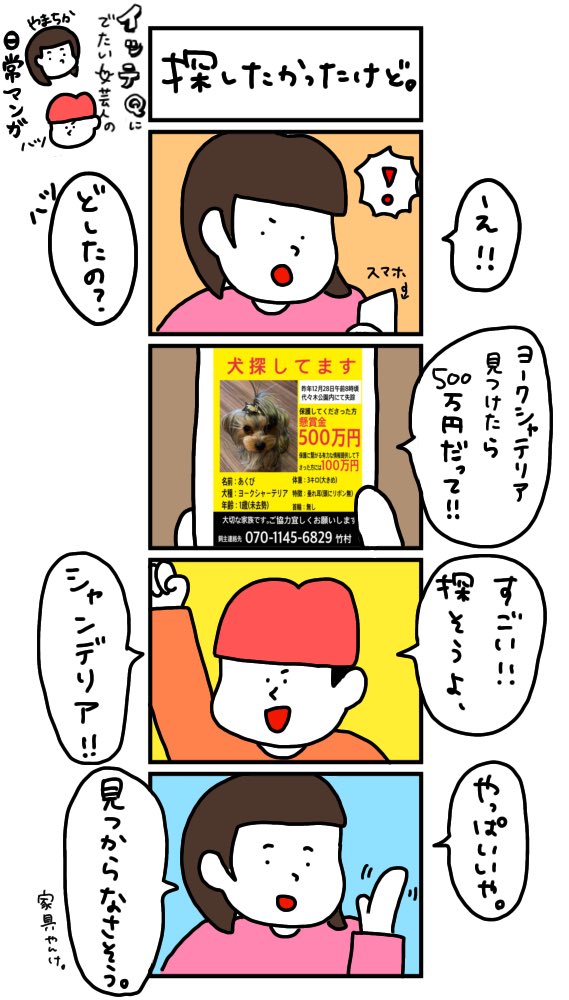 2 6 それにしたってわんちゃん、見つかるといいなぁ。 #てづくり4コマ #漫画が読めるハッシュタグ 女芸人てづくりパンの日常実録漫画です 22/02/08 19:17