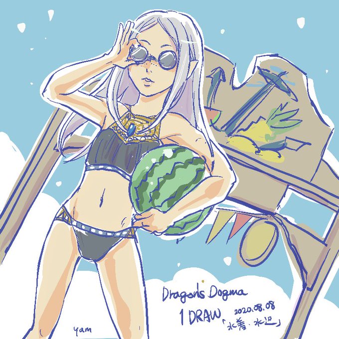 #ドグマ版深夜の真剣お絵描き60分一本勝負 お題「水着、水辺」 #DDON 2019モデルの水着でやっとちびっこがかわいく着られるデザインが!!しかもカメラ制限解除機能までついてて、着飾りに重宝しました、開発さんありがとう!!