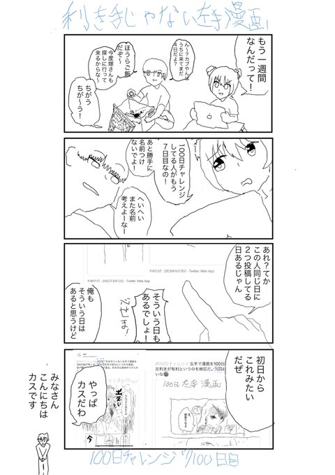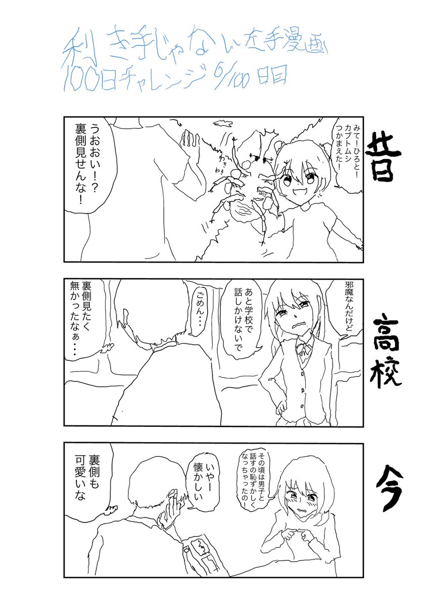 #100日チャレンジ 16日目、利き手じゃない左手で漫画を100日毎日描くぞ!左手だと絵は有利、と言うのを検証。毎日描いてりゃなんとかなりますわ。う○こでもなんかアウトプットしてる方がええですわ。何も出さんとう○こが溜まっちまってダメになる。