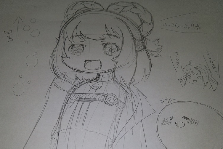 そういえばグラボ替えたから、液タブ繋がってないんだった。と、ちょっと焦り始めて(もっと早く始めろと)アナログでラフして保険を掛ける🤤 うん仕事中🤤🤤🤤 #じゅむぴく