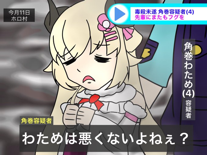 252 1620 #つのまきあーと 昨日深夜、角巻容疑者(4)が フグによる毒殺未遂で逮捕されました 再犯であるにも関わらず、 逮捕の際、角巻容疑者は 「わためは悪くないよねぇ?」 と供述しており警察は…… 20/10/12 01:05