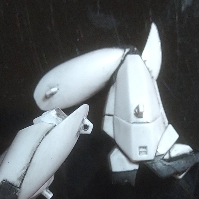 #GWモデリングT製作会2023 #進捗 #イングラム その10 一号車 左肩をリタッチ 脚後の三点ランプ、黒三角黒の上に白円。秘蔵のシタデルのセラマイトホワイト 隠蔽力と発色がスゴい。一発発色。再販してほしい。 耳を再出力。(゚Д゚) #パトレイバー #パトレイバー模型部 #プラモデル