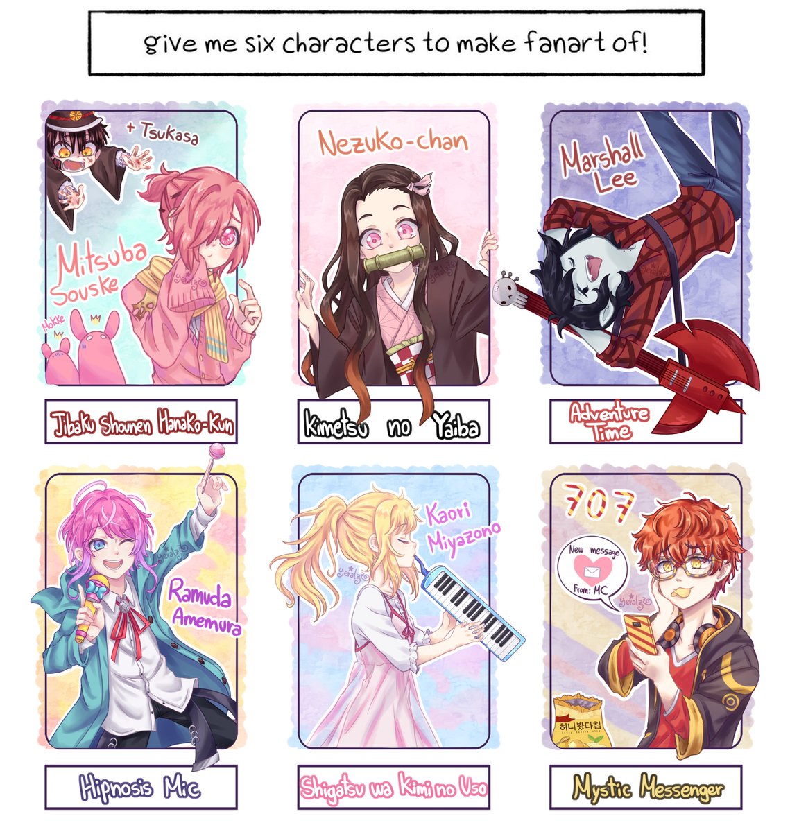#SixFanarts Finally done!!✨✨✨ It was fun and exhausting, but I'm glad I was done before the challenge died~ ;v; RT & Fav are welcome~!! #SixFanartsChallenge #mitsubasousuke #Nezuko #Matshalllee #Ramuda #Kaori #Seven