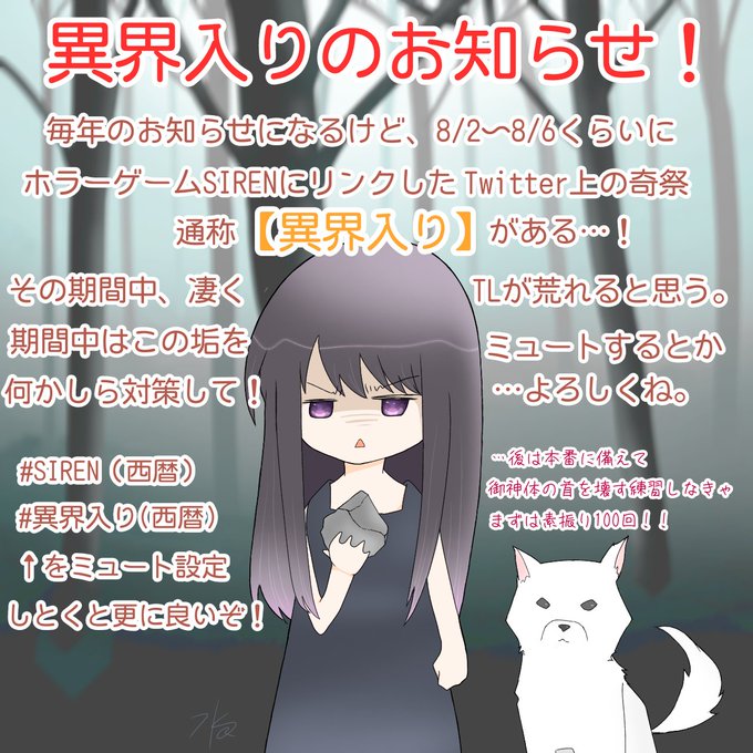 サイレソ知らないよ?8月頭からTL荒らされたくないよ? って言うそこのふぉろわっさん宛 毎年の事でお騒がせ致しますが 言いたい事はこれだ↓ という訳でふぉろわっさん 対策よろしくね! #異界入り2023 #SIREN2023