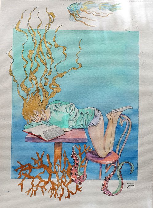 Y ahora en fotos. Gracias de nuevo a @MCiatica por la referencia postural 😉. SE VENDE #inktober2020 #Inktober #Tintober2020 #tintubre2020 #illustrationart #illustration #lectura #soñar #oceano #markers #watercolor #woman