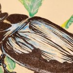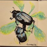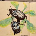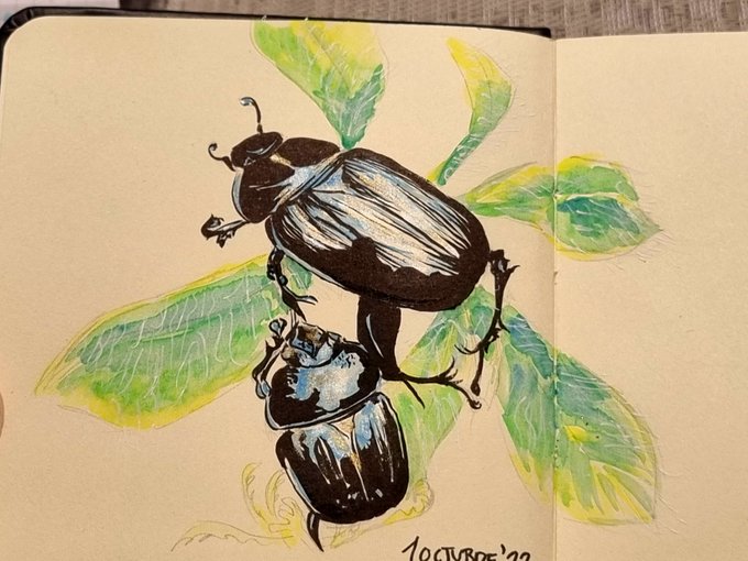Primer #inktober2022 Pincel flexible, acuarelas fluorescentes Koi, rotulador de gel blanco y un cuaderno chiquitito. Me encantan los escarabajos. 🪲
