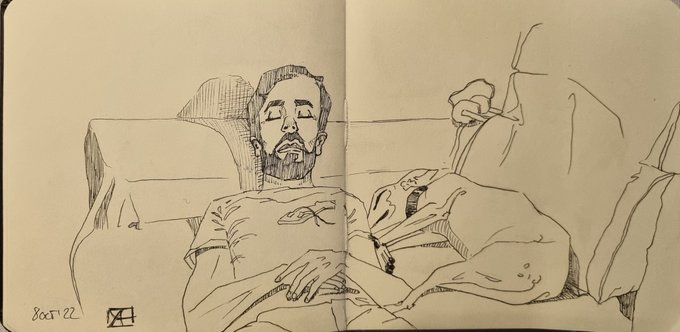 #inktober2022 Día 8. Mi hermano pequeño y una de sus galgas adoptadas. Es más guapo, tengo que seguir aprendiendo a retratar 😉. #sketchbook #portrait