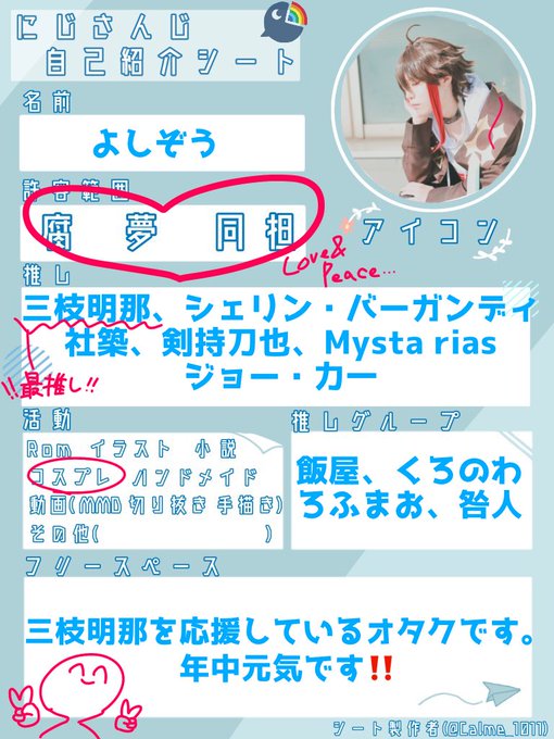 ⚠︎cos⚠︎ 🌶最推しの年中やかましいオタクです! 撮影を通していろんな表現ができたらな〜と思っているので、🌈🕒好きな方と仲良くできたらなと思っています✨ ♻️中心に❤️も巡回します🙋♀️ #にじさんじレイヤーさんと繋がりたい #にじさんじ好きな人と繋がりたい #相互の相互さんと繋がりたい