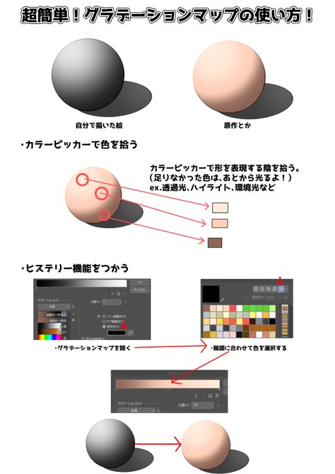 グレイジングと相性の良いグラデーションマップ。 こんな感じで使っています。 肌を塗るときは、ノーマルな物体に入る陰をかんがえ、後から透過する色や光を描き込めばいいと思います。 #サークルドローイング #グリザイユ塗り #浅利治武先生