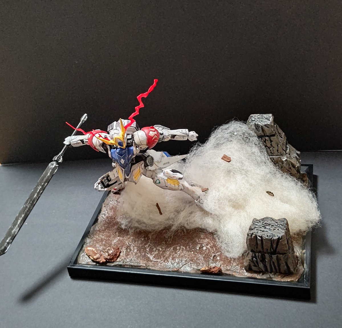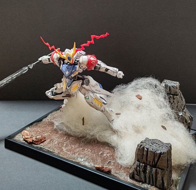 以前から少〜しづつ進めていましたが、なんとかGW終わりまでに完成しました! 人生初のジオラマです😭 爆煙を避けながらというのをイメージして作りました。 #ガンプラ #ジオラマ #ガンダムバルバトスルプス #ガンプラ好きと繋がりたい #ガンプラの画像貼るとRTされると聞いて