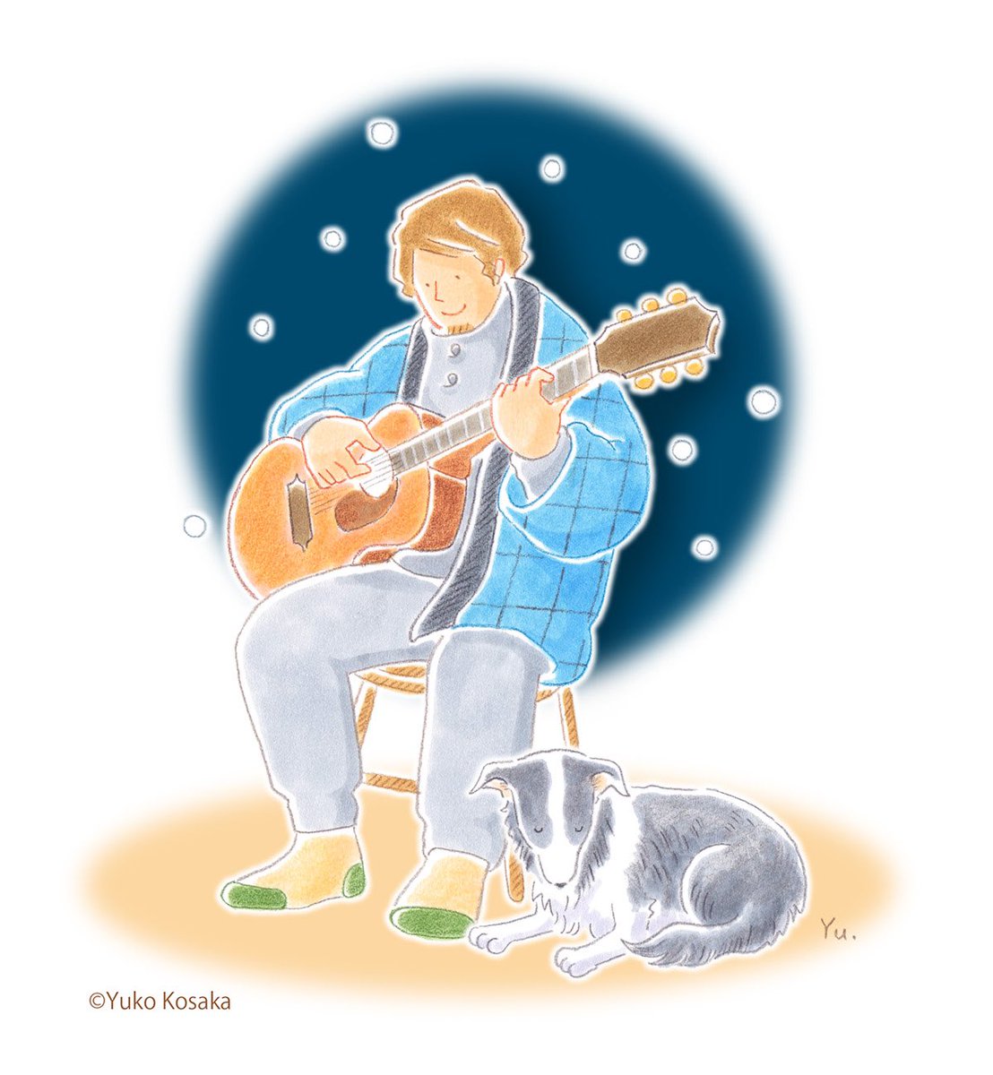 三寒四温、 雪降る夜も きみと… #イラスト #アコースティック・ギター #犬