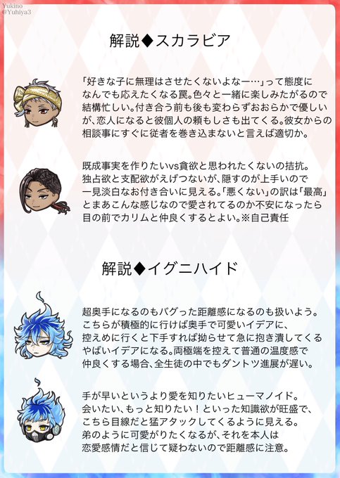 1142 11.8K ホワイトデーなのでNRC生徒の手の早さと遊ばれ具合をチャートにしました① 各キャラ詳細続きはツリーにて ※女監督生相手を想定・作者個人の解釈を大いに含みます #twstプラス 23/03/14 21:00