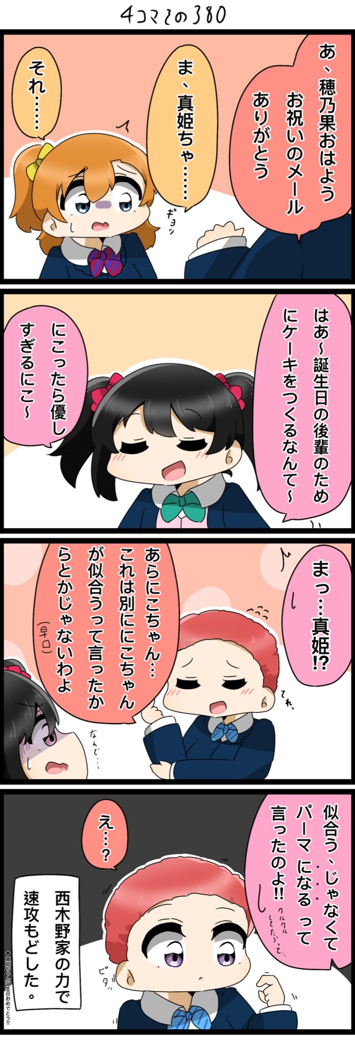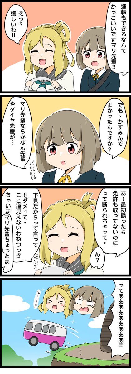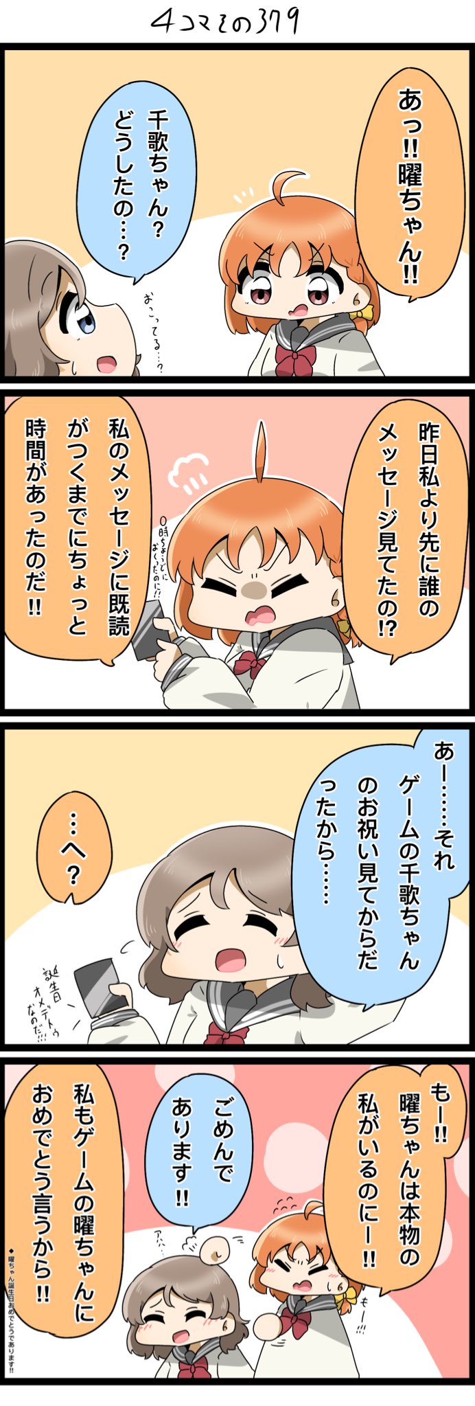 今日の4コマです✨️⛵️🎉 曜ちゃん誕生日おめでとー!!! 2人の千歌ちゃんにお祝いされる曜ちゃん。 #lovelive #Aqours #渡辺曜生誕祭2023 #渡辺曜誕生祭2023