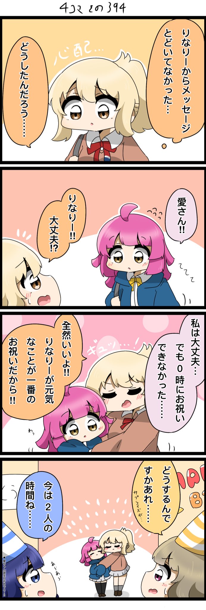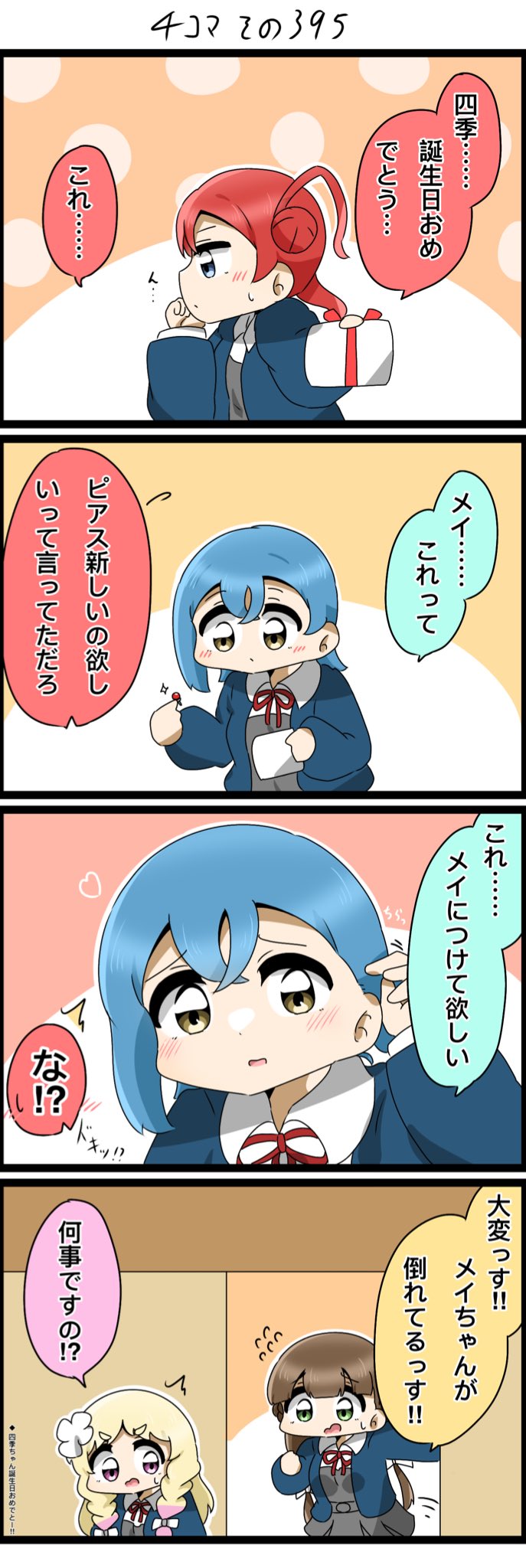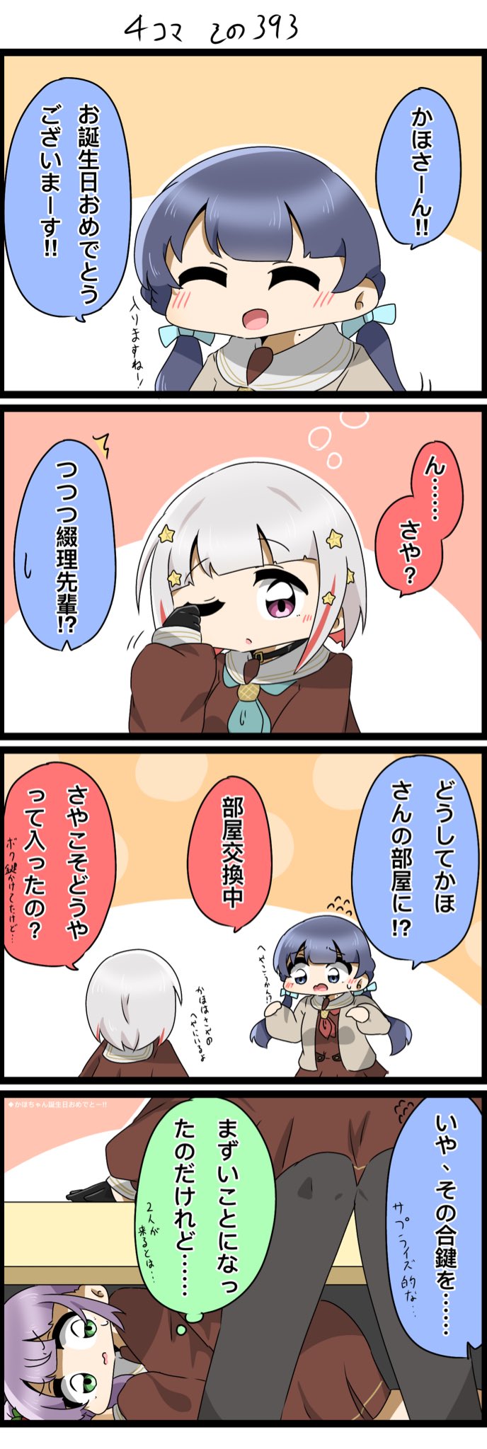 今日の4コマです✨️🐰🎂 かほちゃん誕生日おめでとー!!! かほちゃん不在の部屋に集まった3人。 #lovelive #蓮ノ空美術部 #日野下花帆生誕祭2023 #日野下花帆誕生祭2023