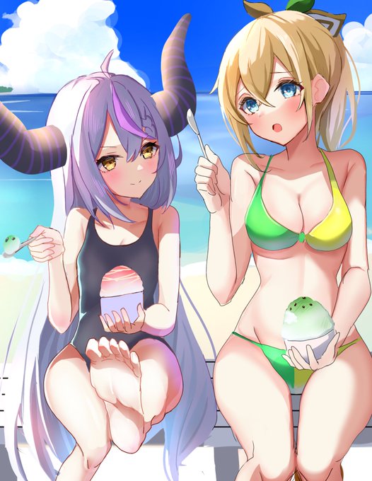32 98 水着になるラプラスさん(しっぽ忘れて再掲) こっち見るなよ! #laplus_artdesu #ド直球に言いますがフォローしてください 22/10/04 20:56