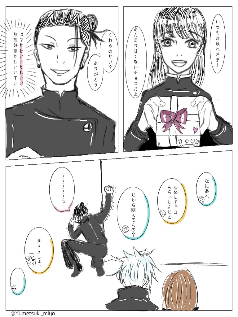 ⚠️夢(夢主顔アリ)両片想い。 バレンタインネタです。 初漫画なのでいろいろおおめにみてくださると幸いです… #夢術廻戦 #じゅじゅプラス