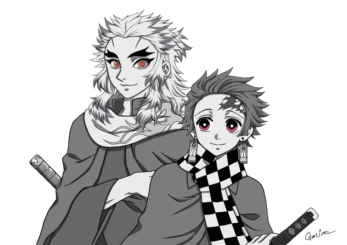 2 23 鬼滅最推しツートップの煉獄さんと炭治郎くんを描きました! グレースケールで瞳だけ色を付けての仕上げです🖌️ 推しはエネルギーを爆上げしてくれますね!⤴✨ さて、本日よりご依頼頂いているイラストの制作を再開して参ります! 23/03/17 07:00