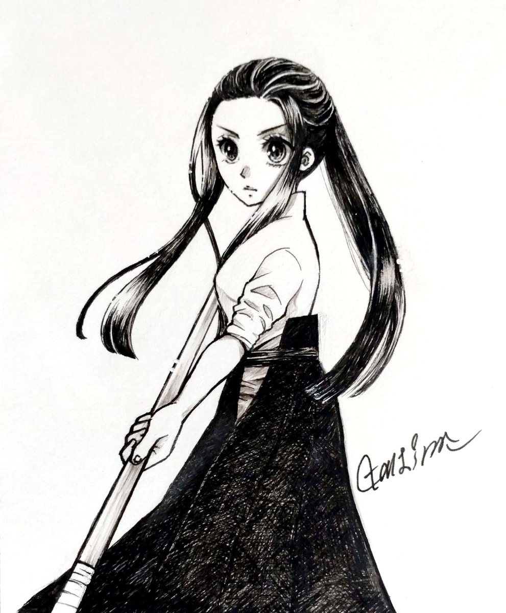 息抜きのつもりが気が付いたらペン入れまで終わってました… おっとりとしたふわふわな女の子も好きなんですが、 キリッとした武闘派女子も良きですよね⚔ #アナログ絵 #アナログイラスト
