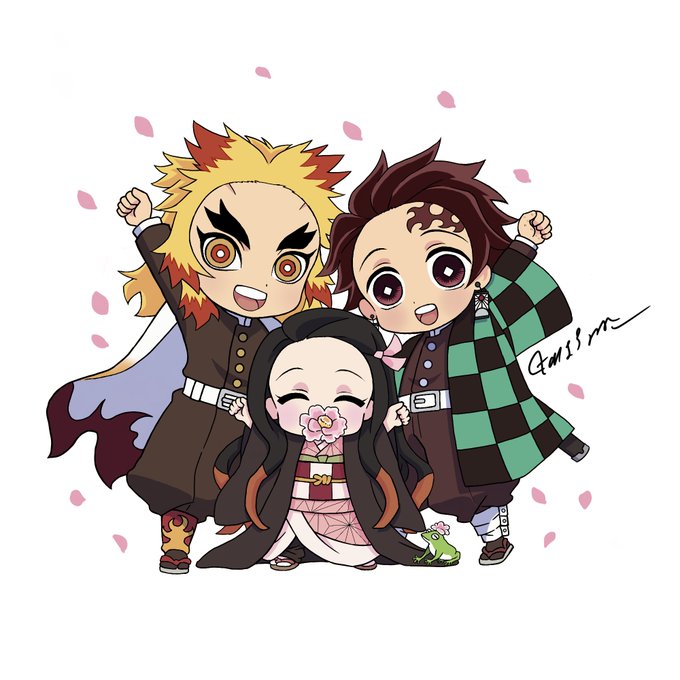 おはようございます✨ 吾峠呼世晴原画展、 鑑賞記念絵です🙂✨ 【煉獄杏寿郎と竈門兄妹ミニキャラVer】 後でお写真とタイムラプスも上げていきます🪄
