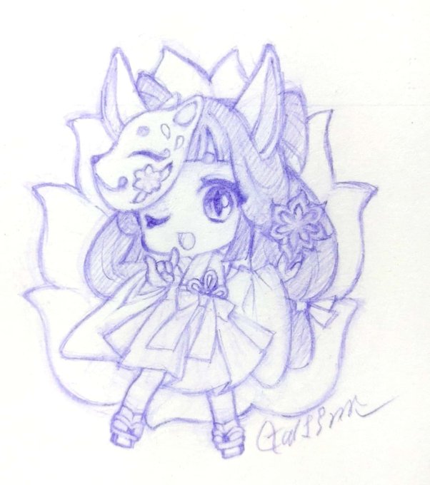 ※キーホルダー新作下描き_φ(・_・ 【九尾の稲荷ちゃん🦊】 いつも通り色々と拘っておりますが、 お気に入りは麻呂眉です(*'ω'*)♥️ #オリジナルイラスト #デフォルメ