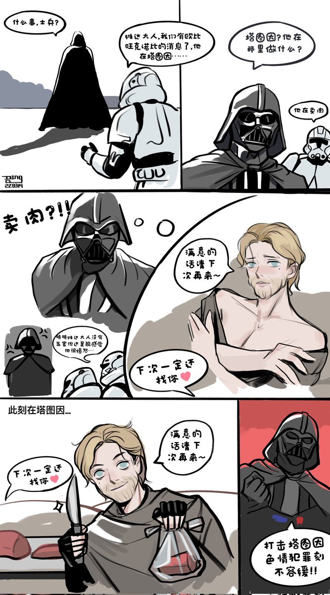 107 409 In Chinese, "selling meat" sometimes means "selling your body," so Vader was confused and angry when he heard obi-Wan was selling meat…… 22/06/17 21:57