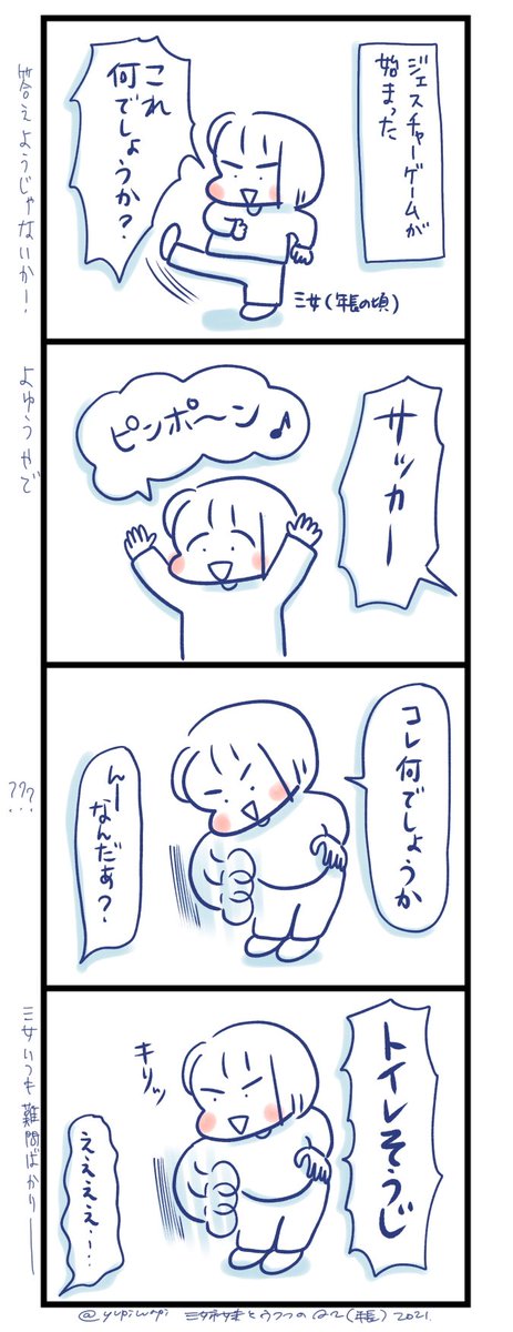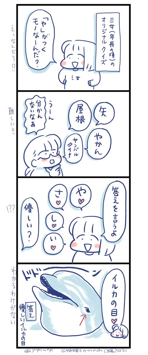 三女(年長の頃)のオリジナルクイズが難問すぎる #三姉妹とウフフの日々 #育児 #育児漫画 #育児日記 #4コマ漫画 #漫画 #マンガ #エッセイ #漫画が読めるハッシュタグ #みんなで楽しむTwitter展覧会