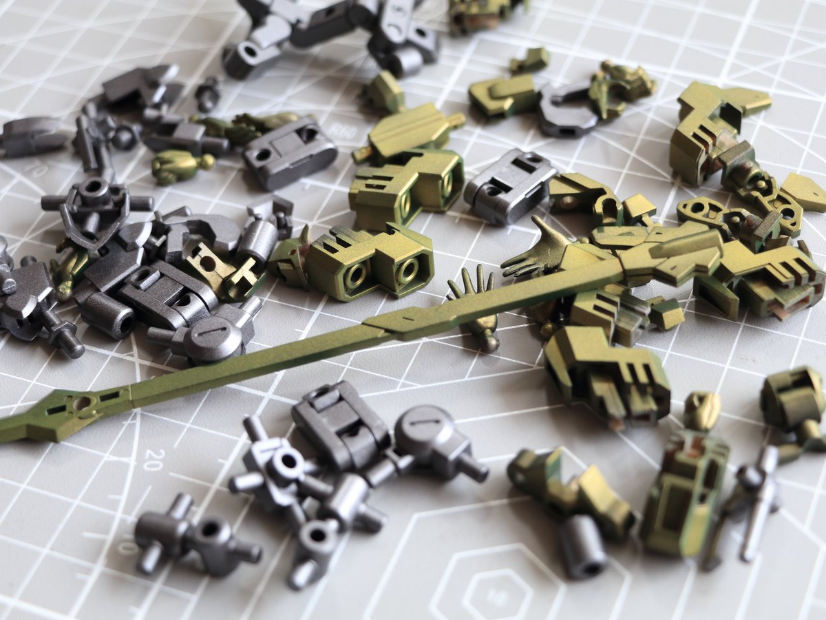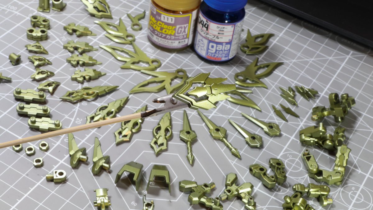 1 4 スサノオの…金!! サフエヴォのガンメタに、GXクリアゴールド+クリアーブルーを調色したものを。 本当は他の色をもっと重ねたかったのですが、金パーツは嵌め込みや可動部分が多かったのでなるべく層を薄く。 蒼炎らしい冷たくも重い金を意識してみました! #メガミデバイス 23/02/12 02:12