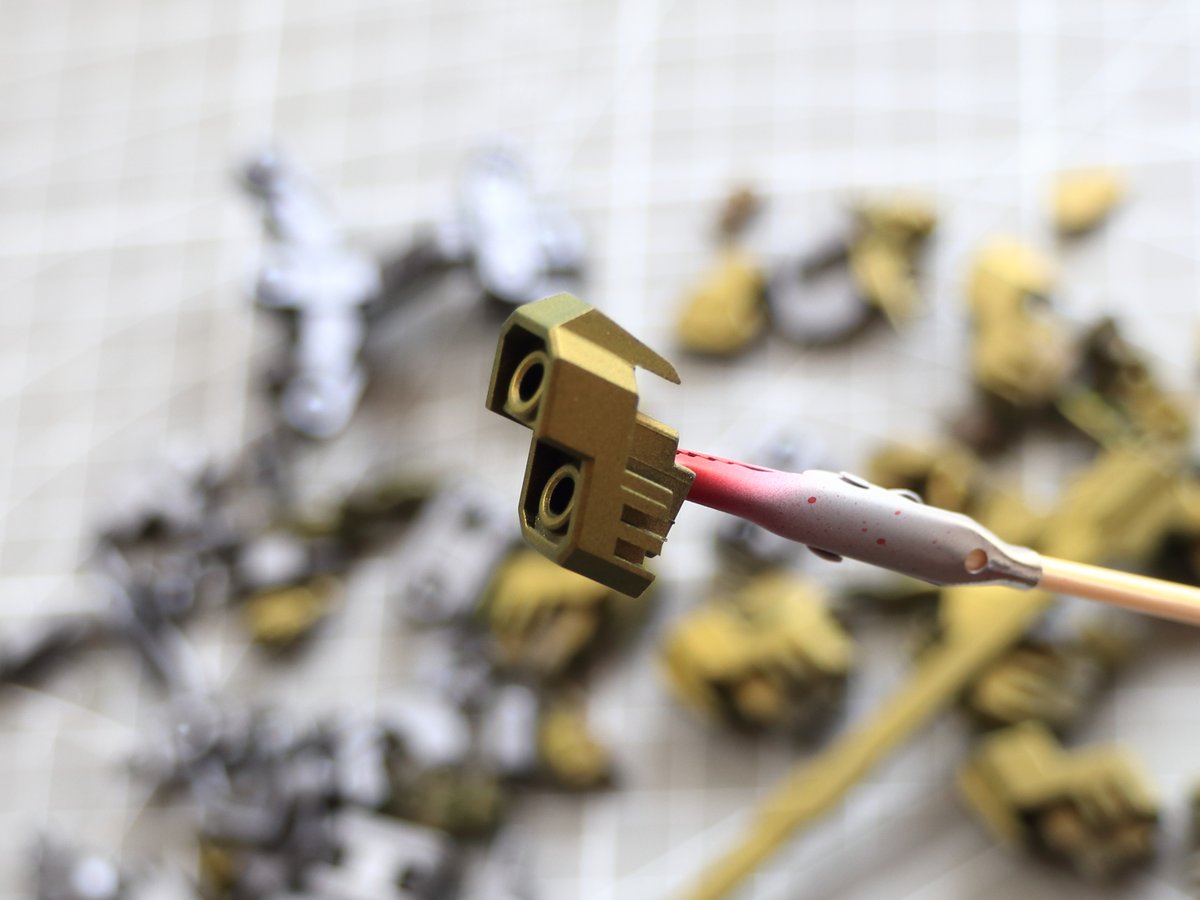 やっぱり据え置き型コンプレッサーは最高! 作業が捗りますね。 金属色を塗装。重厚感のある金にしたかったけれど、半光沢を吹いたらくすんだような金色に… キャラものっぽくない色になったかも。 #メガミデバイス