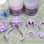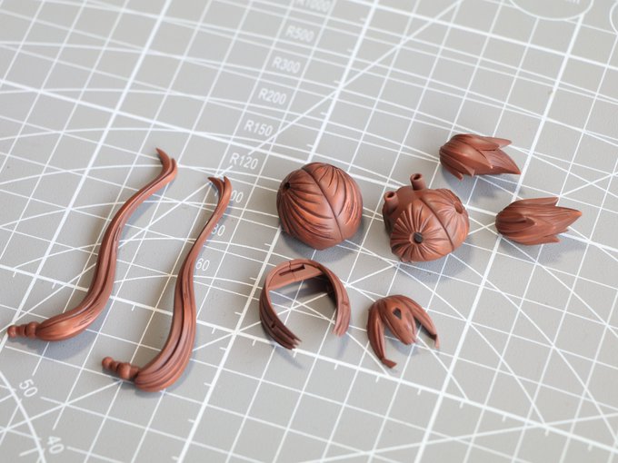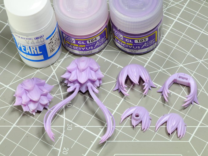 1 11 スサノオの…髪!! ラスキウスを使用。 元のパーツの色味がよかったのでこれを中間色に、ローライトにライラック、毛先にピンクパープルを吹くサフレス仕様にしました。 最後にスーパースムースクリアーでコートしたのですが、これにパール粉を少量混ぜマットな輝きを表現しました。 #メガミデバイス 23/02/21 21:34