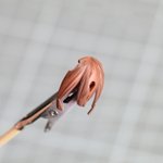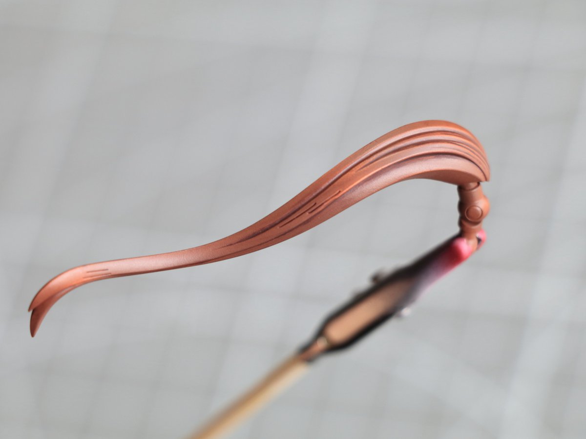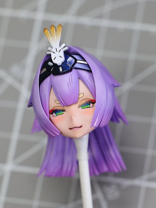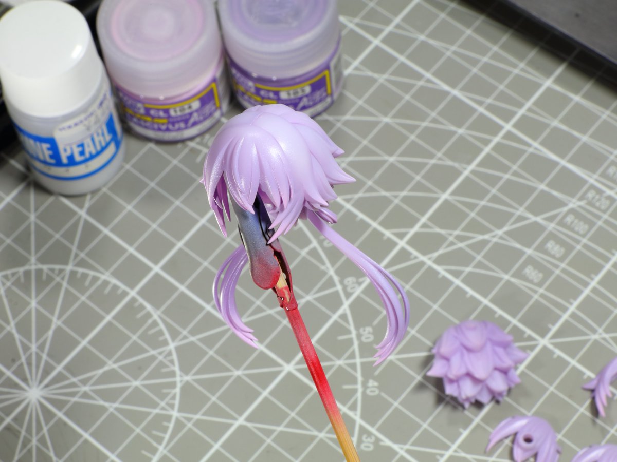 スサノオの…髪!! ラスキウスを使用。 元のパーツの色味がよかったのでこれを中間色に、ローライトにライラック、毛先にピンクパープルを吹くサフレス仕様にしました。 最後にスーパースムースクリアーでコートしたのですが、これにパール粉を少量混ぜマットな輝きを表現しました。 #メガミデバイス
