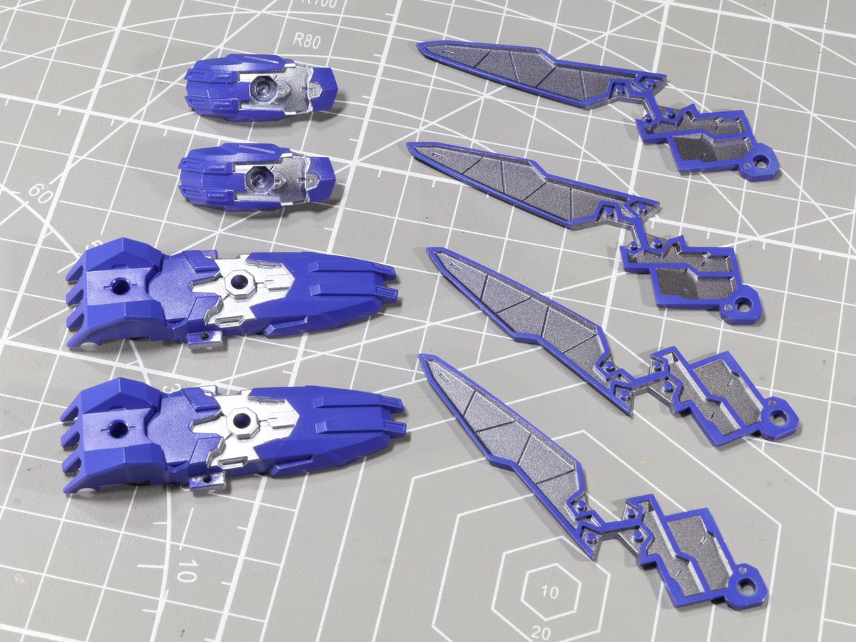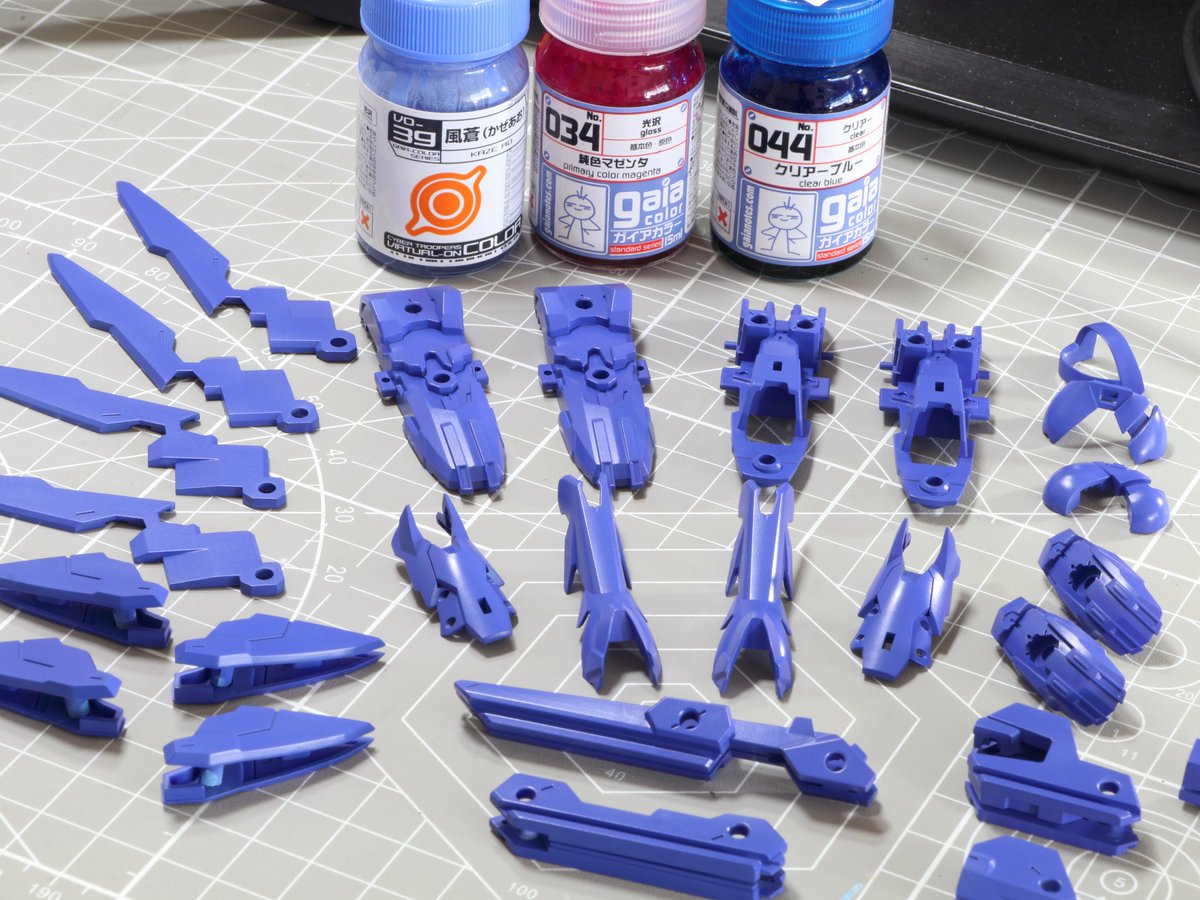 スサノオの…青!! 風蒼+純色マゼンタ+クリアーブルー 金との相性を考えて、少し赤みのある青にしてみました。 あとパーツでほぼ隠れますが、クリアパーツの内側をシルバーで。パネル裏をガンメタで。 #メガミデバイス