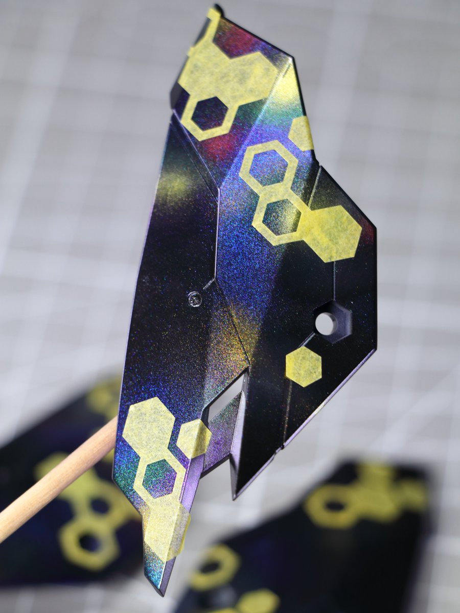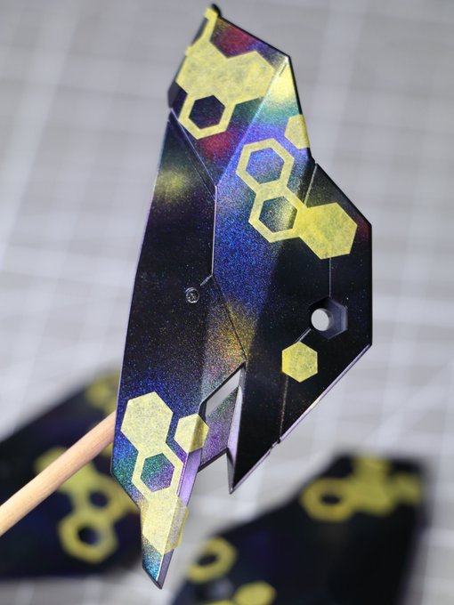 2 10 胸パーツとオリジナルの帯パーツにもヘックス迷彩の柄模様を。 しかし…情報量を加えすぎてごちゃごちゃして見えるかな…🤔 #メガミデバイス 23/04/09 19:45