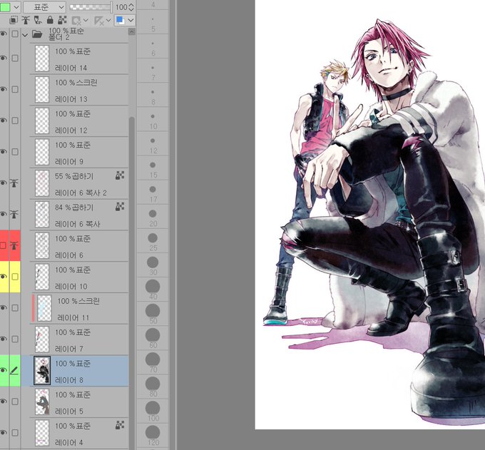 보통 채색은 모두 가색으로 마스킹을 마친뒤 1 상위에 레이어 1개 생성 2 동일 색 일괄 선택 요술봉으로 각 밑색 선택 3 원 레이어 묘사 순으로 하고있습니다 밑색 따로 빼 확인을 할수있는것도 그러한 이유로써..채색 레이어가 3개 이상 넘어가면 스트레스가 너무 심해져서 개발한 워크플로우입니다