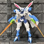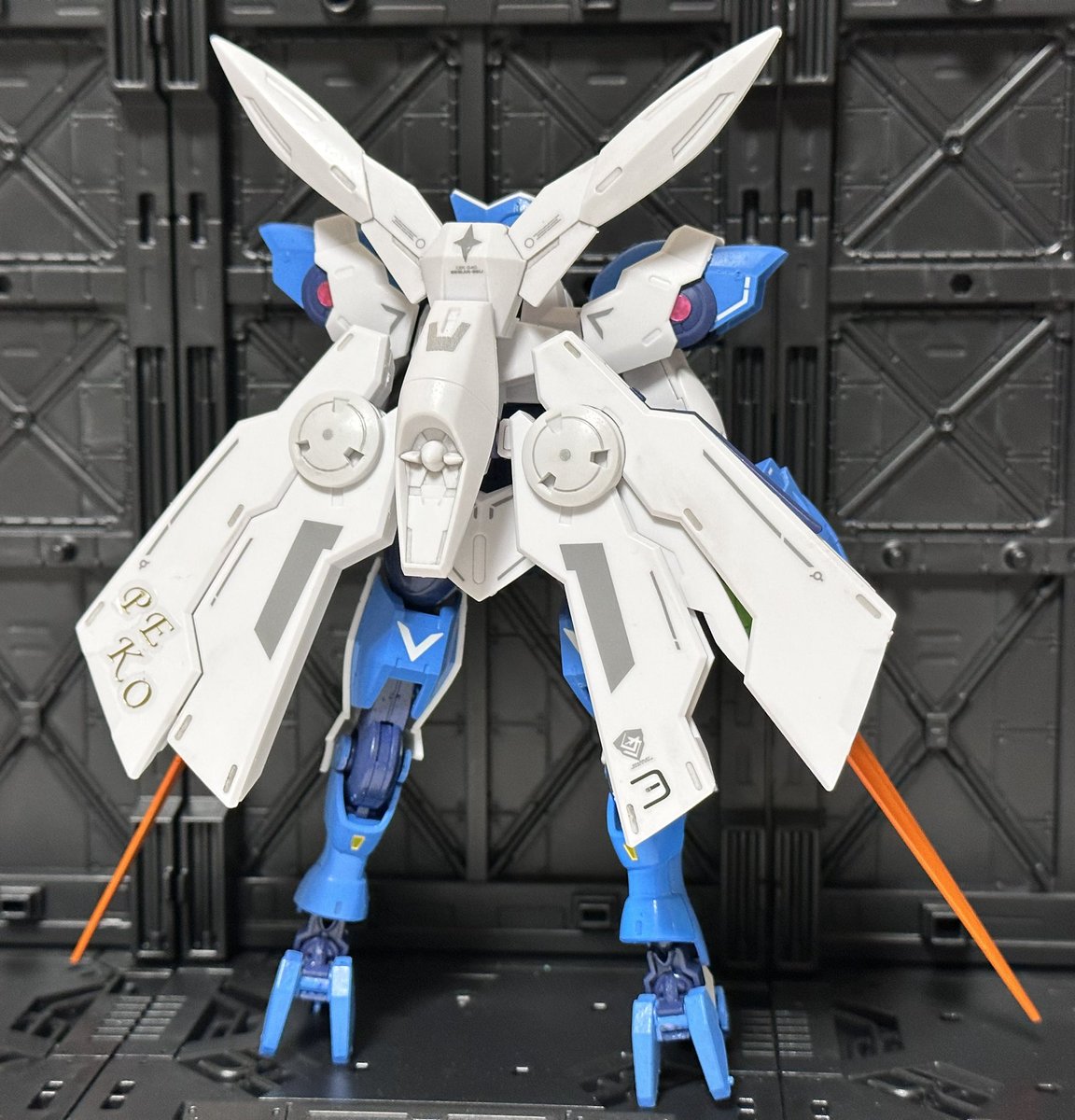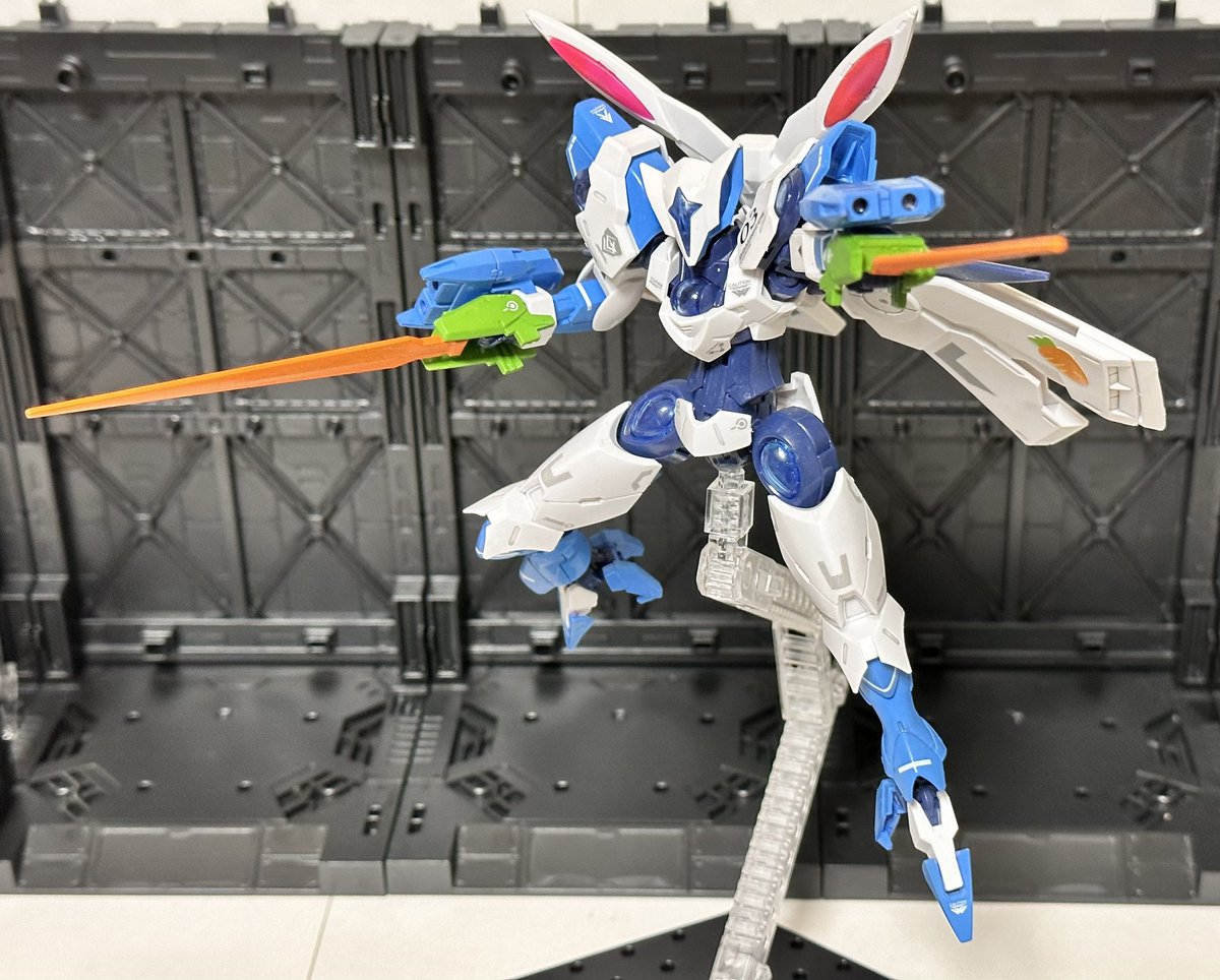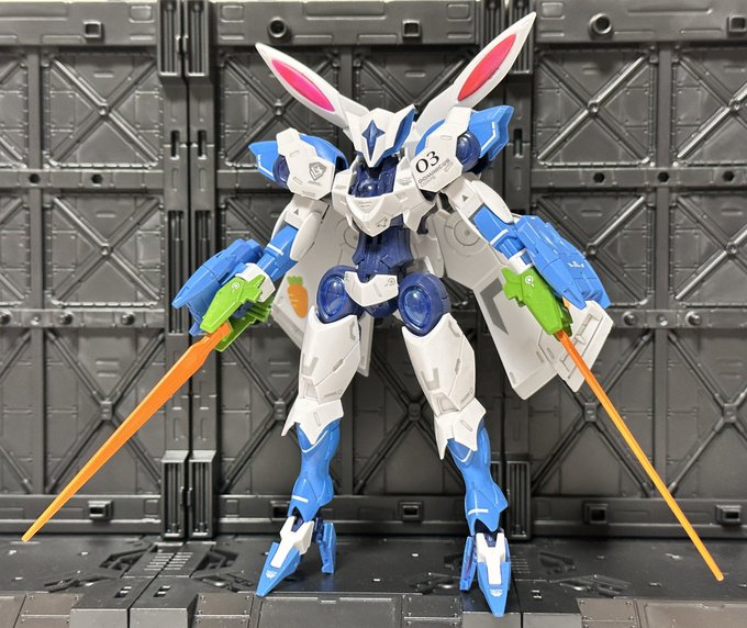 お待たせしました👍 兎田ぺこら専用ベギルベウ完成しました~ ベギルベウのシルエットが兎のシルエットにしか見えなかったのでやってみようかと(゚∀゚) こちらは『前期型』でニンジンをイメージしたベイオネット装備になっています。 #ホロリスガンプラ部 #ぺこらーと #ガンプラ