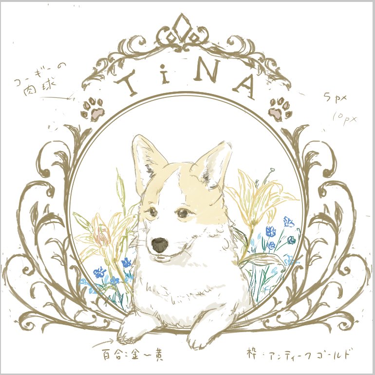 一枚目 イメージ画 二枚目 ヒアリング後ラフ 三枚目 完成 四枚目 背景差分 わんこ可愛く描けるようになりたい。わんこは愛くるしい。 #このタグを見た人はラフ画とその完成絵を見せる #絵描きさんと繋がりたい #アンティーク枠