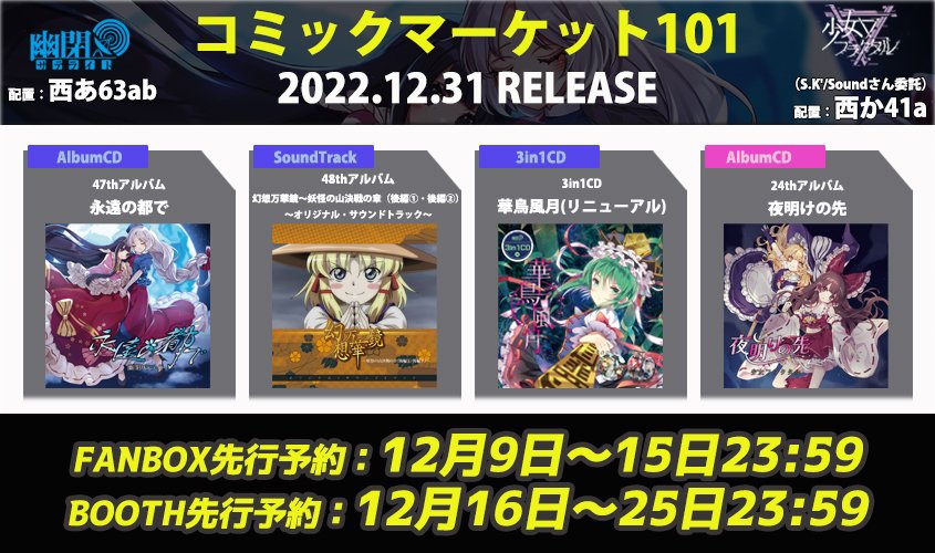 ・*:..。o○─────── コミックマーケット101XFD公開🎋🌙 ────・*:..。o○ 47thアルバム「永遠の都で」 youtube.com/watch?v=AWXVbW… 48thアルバム「幻想万華鏡~妖怪の山決戦の章(後編①・後編②)~サントラ」 youtube.com/watch?v=2p1nsp… 👉BOOTH予約は12月15日より受付開始! #C101 #冬コミ