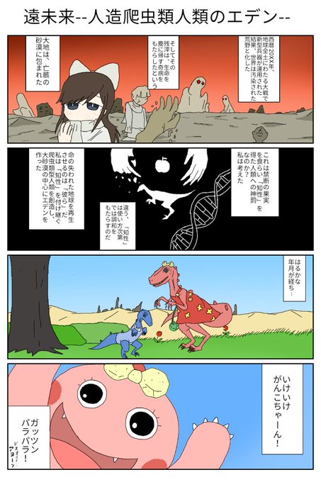 遠未来--人造爬虫類人類のエデン--(1/2) 驚かないでくださいね?これ、ほぼ公式ネタなんですの。 #ざわざわ森のがんこちゃん #がんこちゃん #がんこちゃんエピソード0 #ディノサウロイド #萌えがんこ #漫画が読めるハッシュタグ #SF #ポストアポカリプス