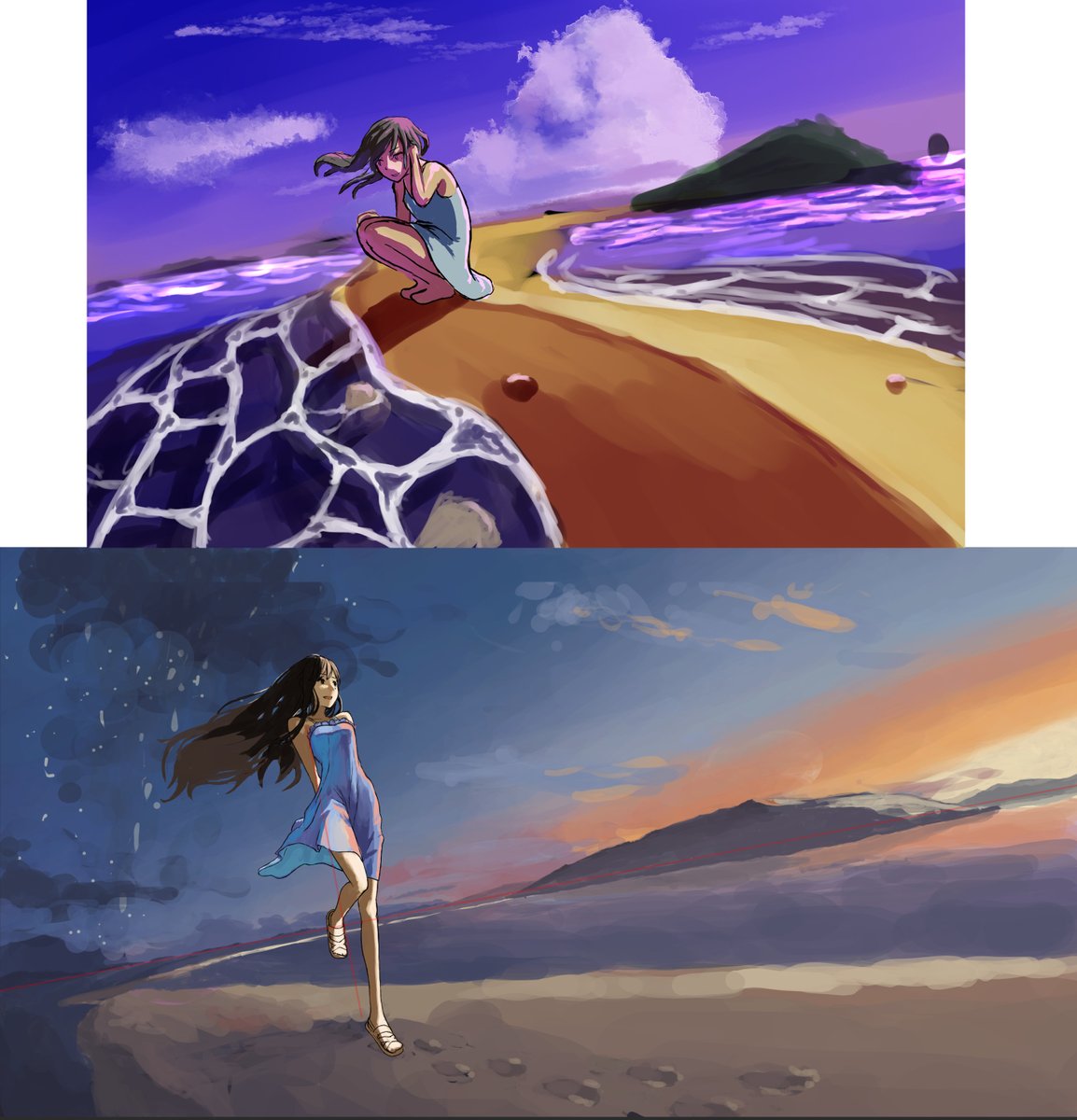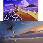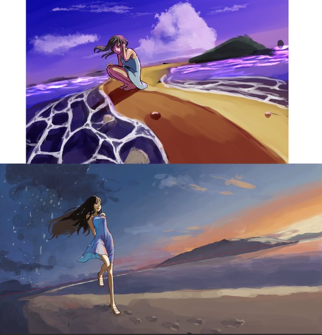 ↑2021.jan idea rough ↓2023.jul color rough 上のアイデアラフから描きおこしたんですが、ラフとはいえ流石に恥ずかしい(笑) 当時は夕焼けの色合いがわからなくて描けなかったんですよね また二年たったら今の絵を見て恥ずかしいといえるように頑張りたいなぁ #イラスト