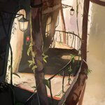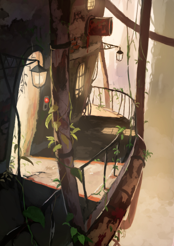 路地っぽいの。 グレーラフだと手前に光の面がありますが、描き終えた後に全部影面の方がいいんじゃねと思ったので上から加筆したりしてます。 #イラスト #背景