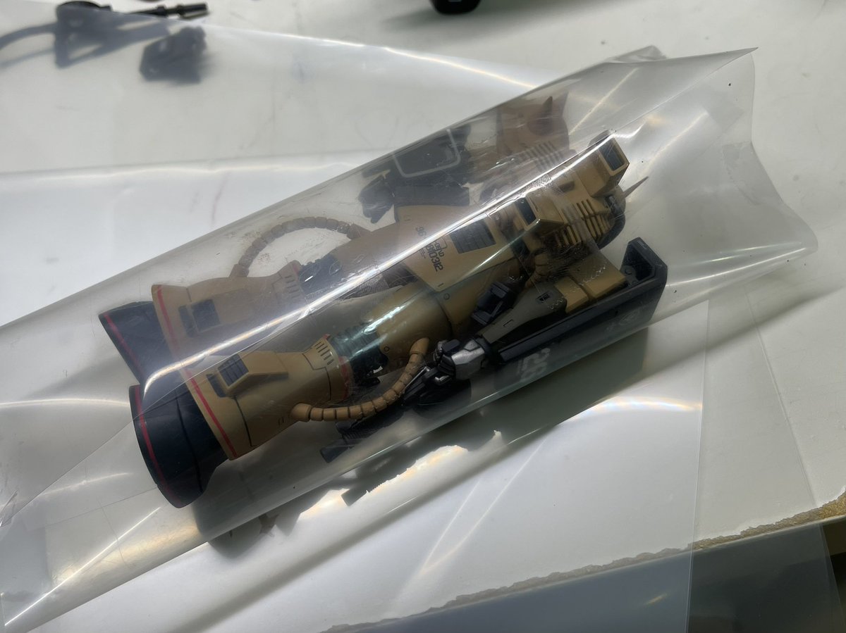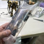 #知ってるモノの作り方 ジムキャノンのバイザー。キットからバイザー部分を丁寧に切り出し写真のような型を作成→透明UVレジンを型に入れ垂れないうちにクリアファイルで写真ように圧迫後UVライトを当てます。旧キットジムキャノンのようなバイザー断面が円柱のものに限ります。