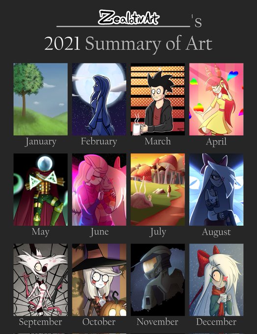 Here's my Art summary for this year. I made all that using Clip Studio Paint! Can't wait to see what I can make next year :>. #Artsummary2021 #ArtistOnTwitter #HazbinHotel #digitalart #CLIPSTUDIOPAINT #fanart #originalart #Halo
