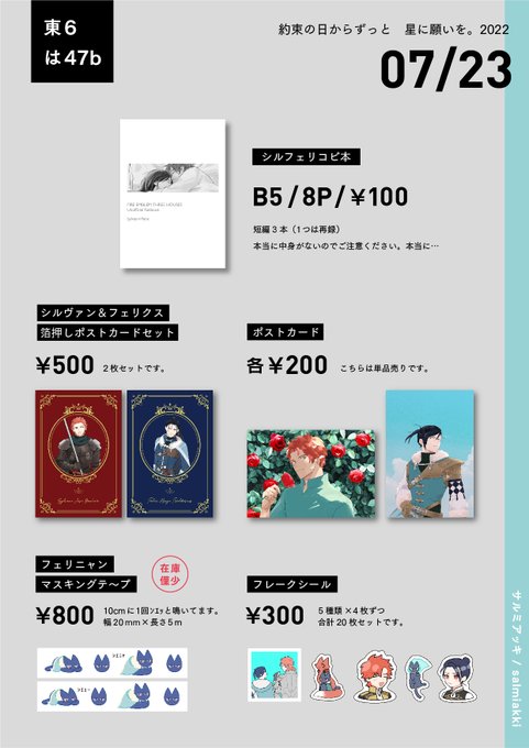 7/23のお品書きです。あらためてよろしくお願いしま~す!コピ本は本当にクソくだらないのでご注意ください😔