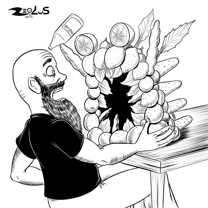 Inktober, Day 11. Sour. EAT ME!! This little food monster is made up of sour fruits like lemons, grapefruit, as well as tamarind, rhubarb, prickles and it's even holding a bottle of vinegar to season itself. #inktober2021 #Inktober #artwork #art #sour #Food #blackandwhite