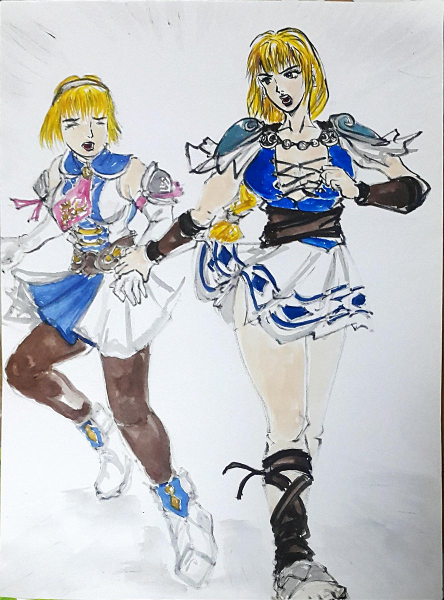 ソフィーティア「帰ったらお仕置きよ!」 カサンドラ「姉さん!許して!」 本当は妹思いの優しい姉ソフィーティアです。 #姉の日 #ソウルキャリバー #SoulCalibur #格ゲーキャラ描こうぜ