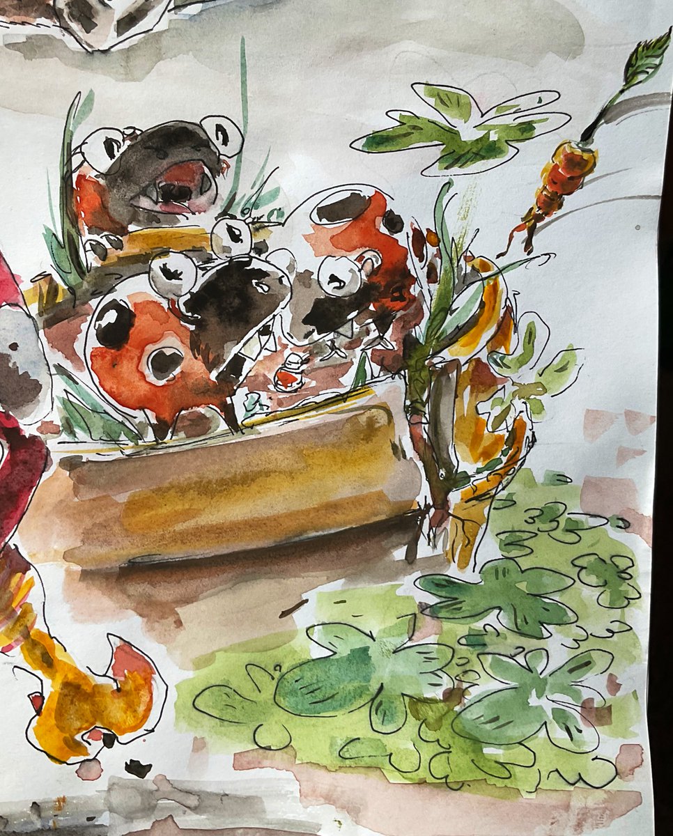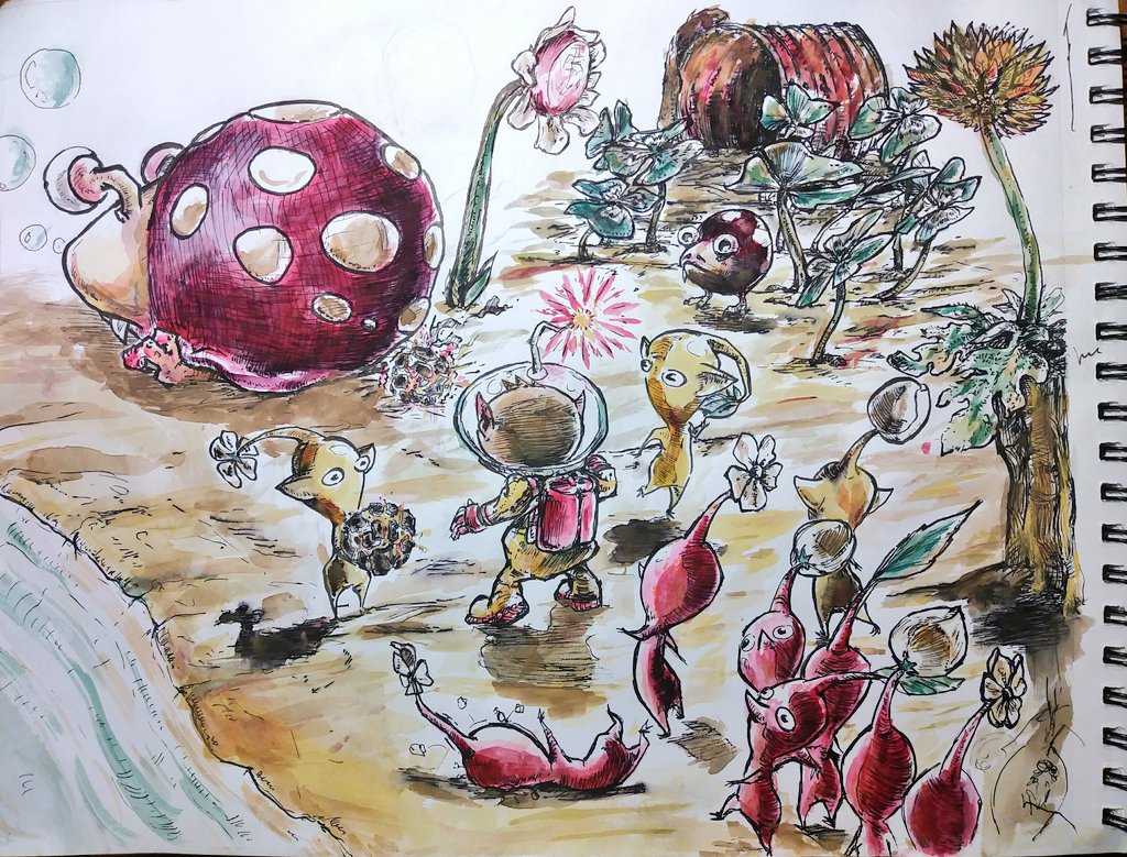 My progress so far! Really pleased with the outlines I’ve gotten so far #pikmin #GameCube #creatures #nintendo #art #ArtistOnTwitter #watercolor #coloredpencil #ink