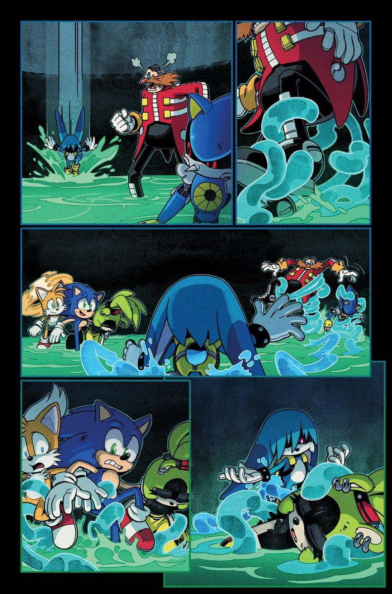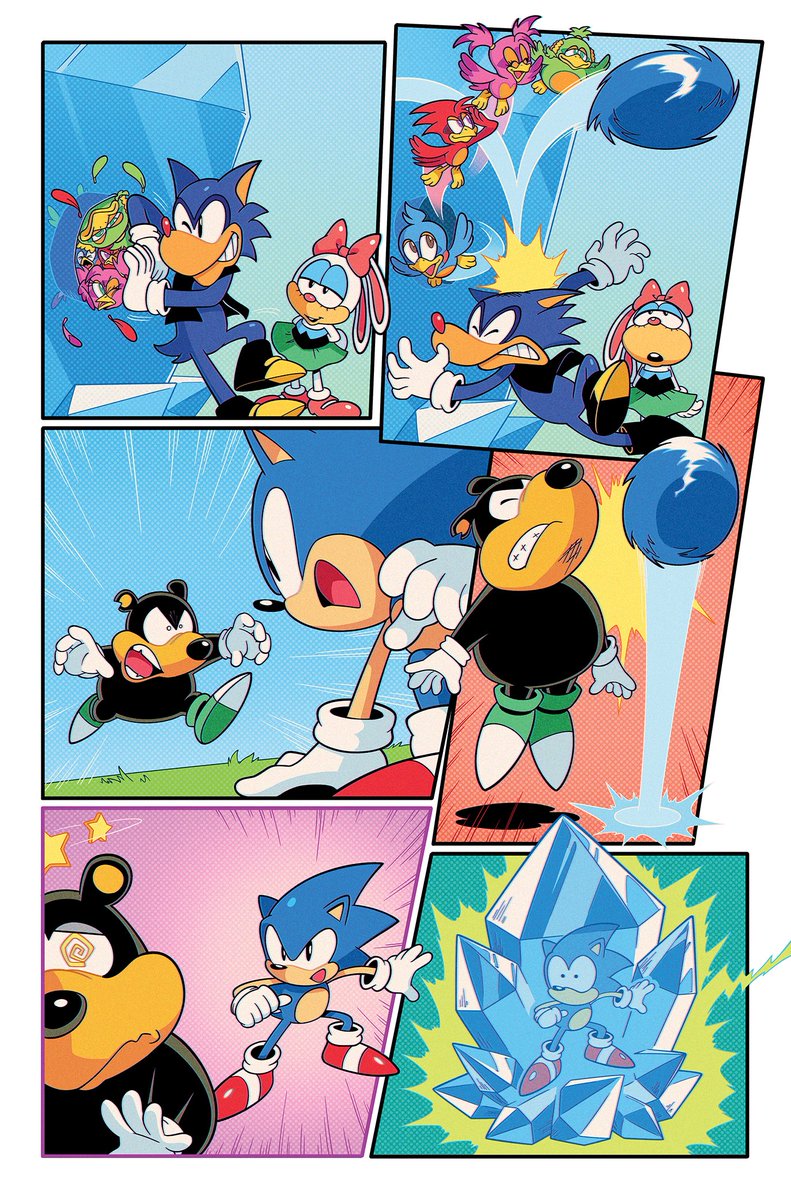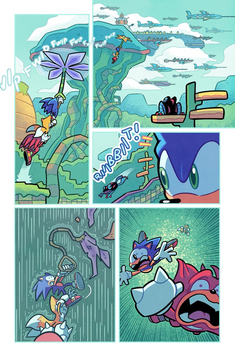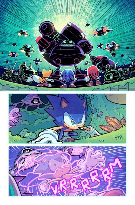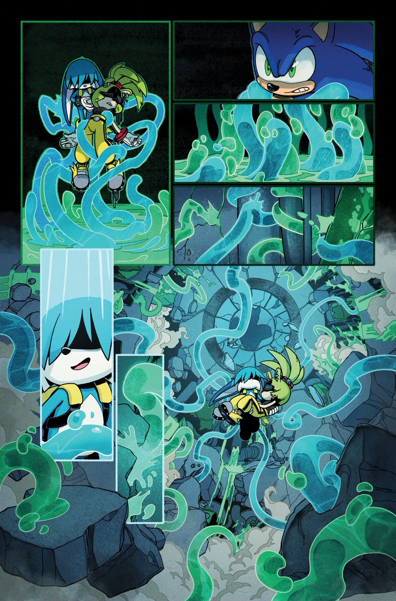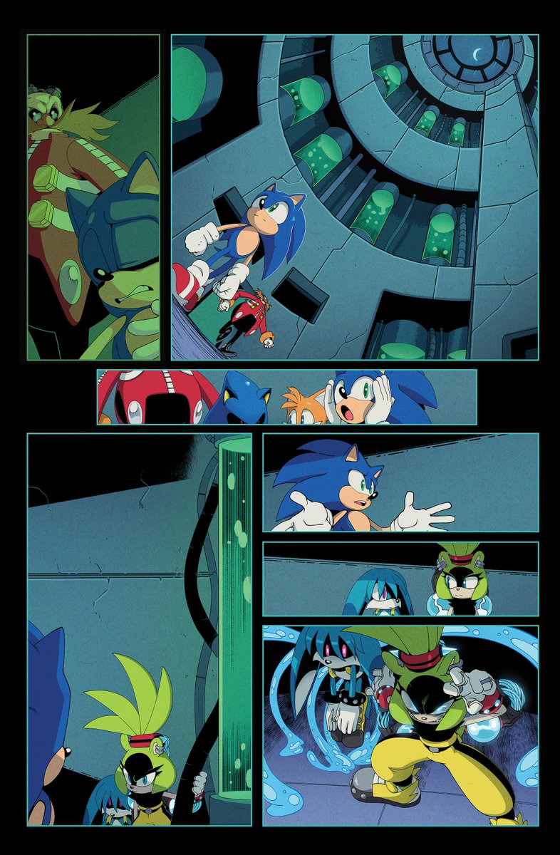 A couple MORE pages I colored for Sonic 56! Fun fact, @SpiritSonic (who drew these of course) also did a lot of the texture shading you see in the backgrounds in this issue, as well as on that lovely panel of rainbow Surge! 🌈 twitter.com/Ziggyfin/statu…